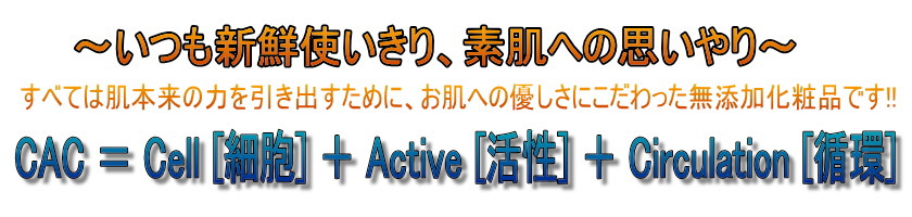 | ~私たちのこだわりCAC化粧品の特徴~ ○品質保持成分 無添加「パラベンフリー」 ○ノンオイル ○保湿成分 糖類・多糖類・アミノ酸配合 ○お肌と同じ 微酸性 ○1回使い切り ○製法特許 |